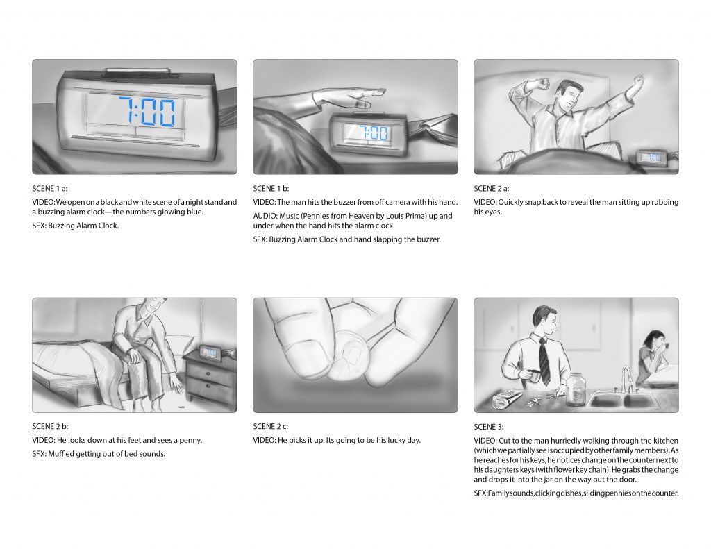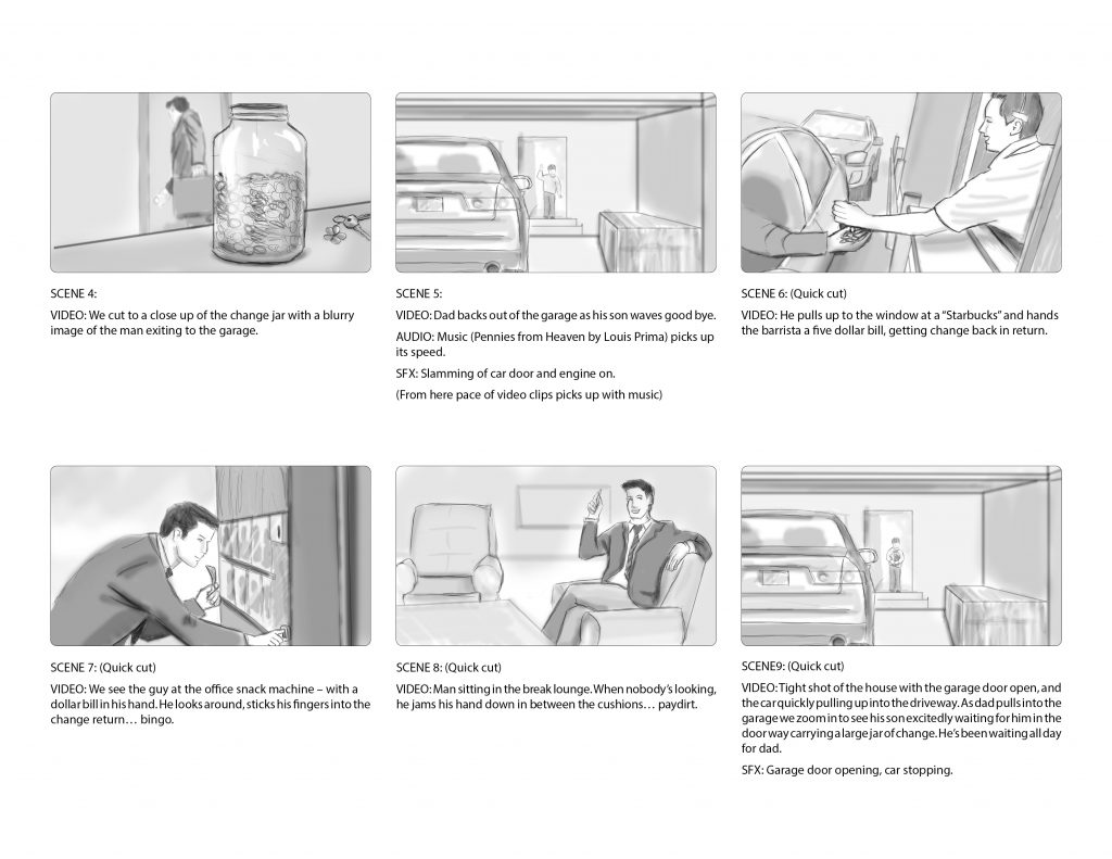 Illustrated storyboards for a 30 second spot concept