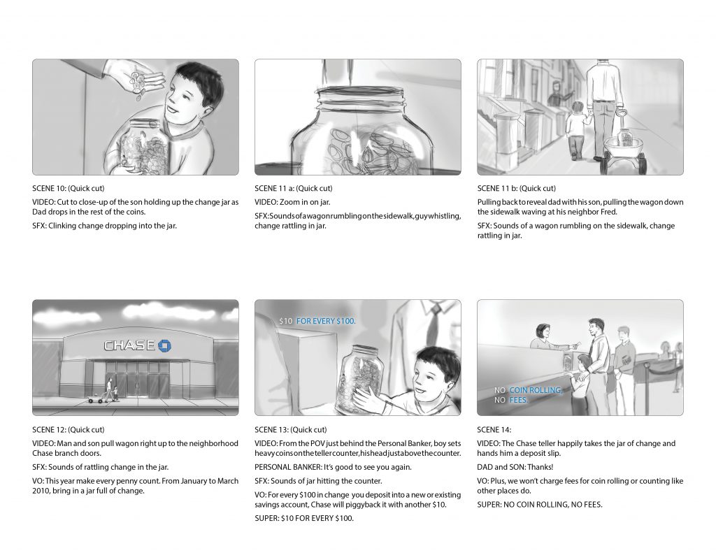 Create a promotional campaign where every $100 deposited in change earns a customer a $10 credit. The campaign’s narrative revolves around a father and son who spend their days diligently searching for loose change. Once they accumulate $100, they embark on a joint journey to the bank, depositing it into a savings account for the son’s future.